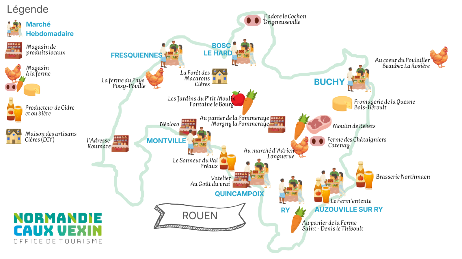 - La Ferme du Pays in Pissy-Pôville: Shop selling chickens, rabbits, and eggs. Open Tuesday, Wednesday, and Thursday afternoons, all day Friday, and Saturday morning.