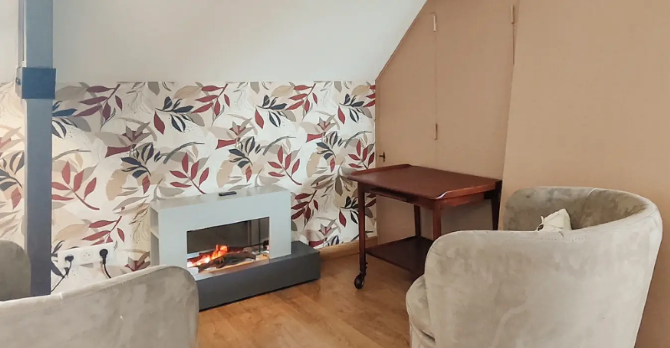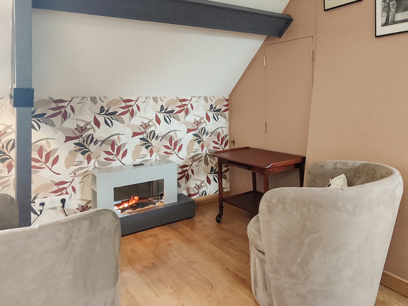 - Reading area: armchairs, electric fireplace