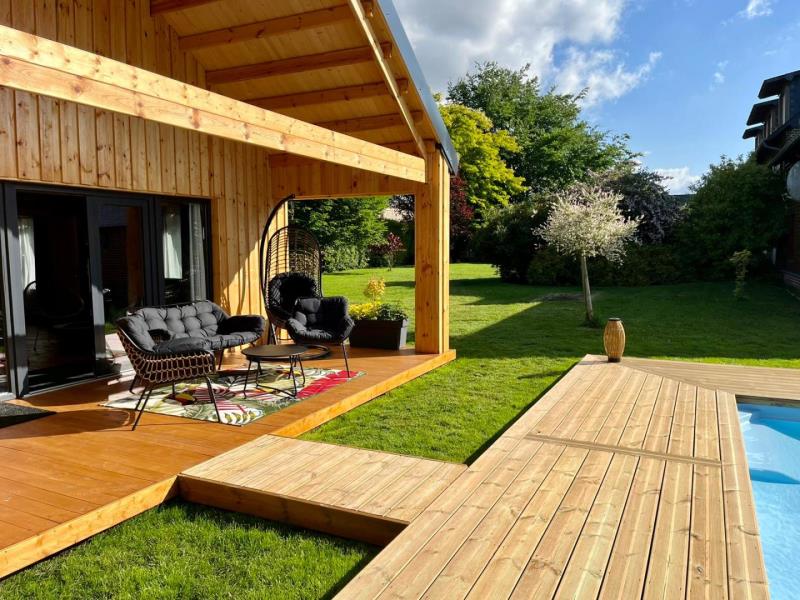 Welcome to the Cottage des Hauts Poiriers, let yourself be tempted by a timeless well-being stay in this chalet decorated with taste and modernity. You can relax by the heated swimming pool from May to September (inaccessible from mid-October to early April) depending on weather conditions) or enjoy the Spa (4 people) available to you all year round, set up in a wooden arbor. facing the terrace. Located in Quincampoix, near the owners' house (not overlooked), this unusual gite offers you an experience where calm, comfort and serenity will be the key words. Ideal for a couple or family stay, everything has been thought out to make your stay memorable: pool games, badminton net, Molky, board games, hammock, deckchairs, Spa with Light Therapy, bathrobes, 4k connected TV... . Ground floor : - Bright living room with living room/lounge and open kitchen opening onto the terrace overlooking the swimming pool,