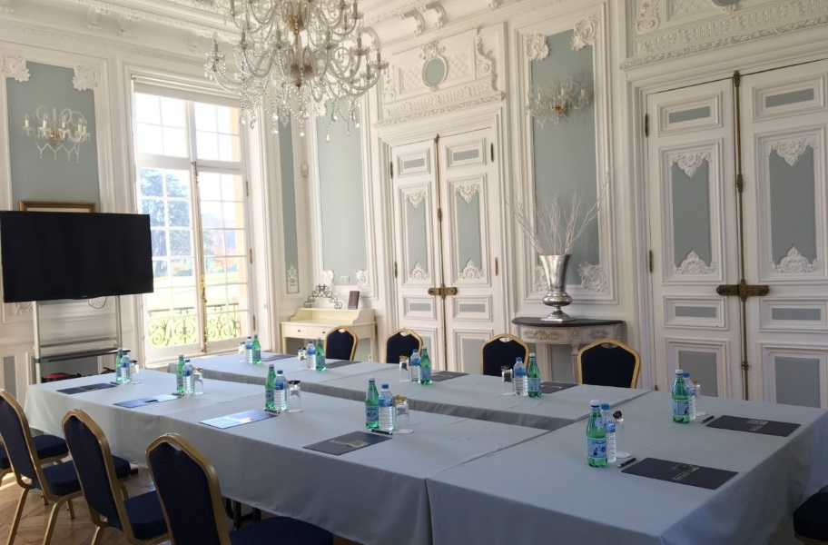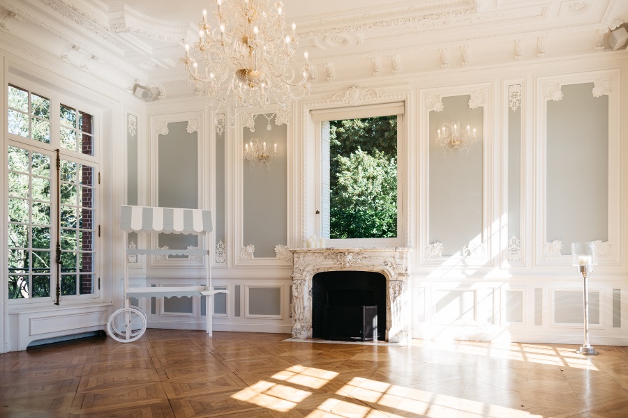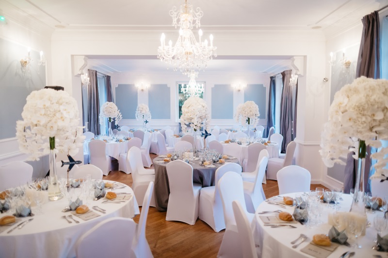 The 200 m² ‘Gala Cristal’ room, with its Murano crystal chandeliers, marble fireplaces and oak parquet flooring, offers a charming setting for a reception.