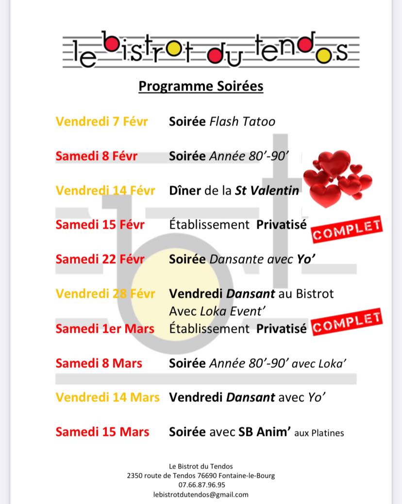 Discover the Bistrot du Tendos in Fontaine-le-Bourg, near Parc de Clères and Lac de Montville. Enjoy our authentic French cuisine with homemade dishes and fresh produce prepared daily. Enjoy our themed evenings every Saturday night. Visit our website or Facebook page for more information.