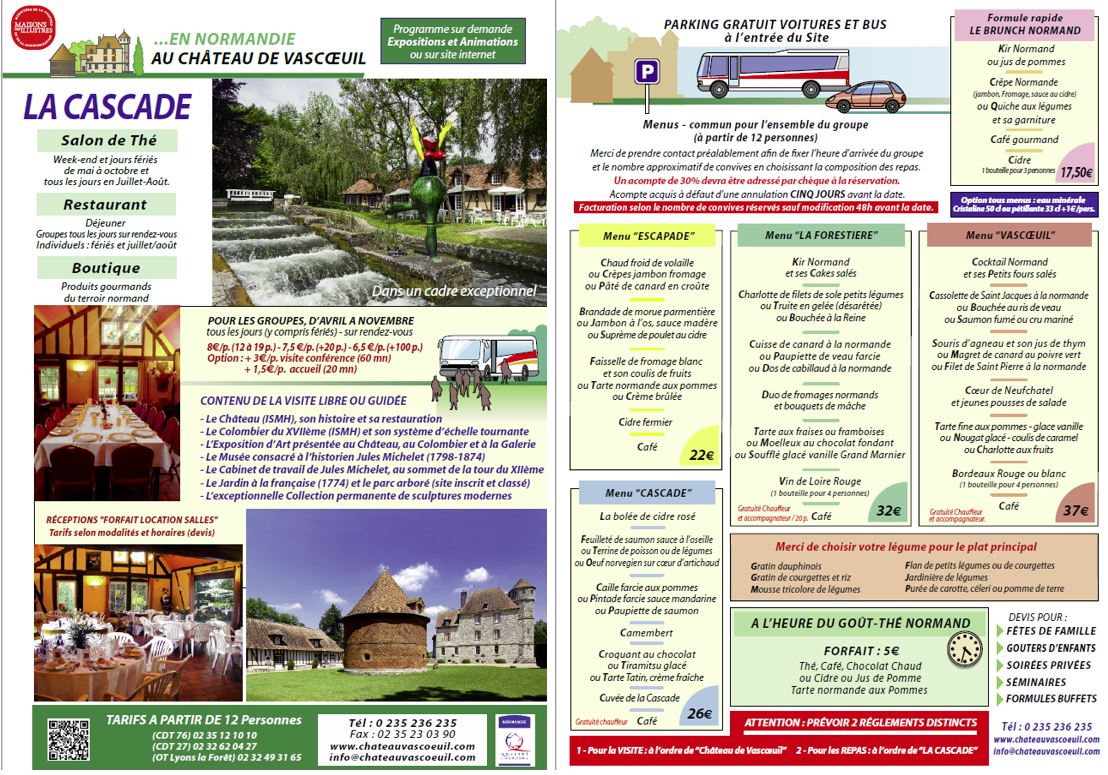 La Cascade is located in the park of the castle near the Crevon and welcomes the visitors of the Art and History Centre for lunch or to have a break in the tea room during the afternoon.
