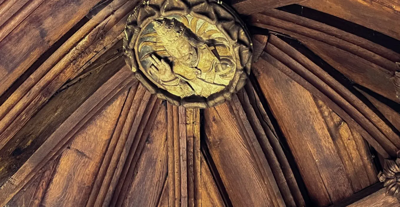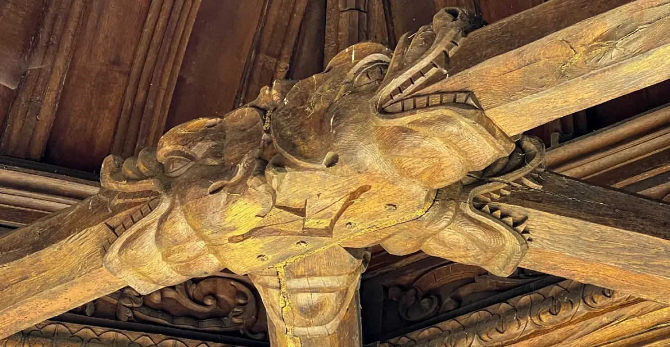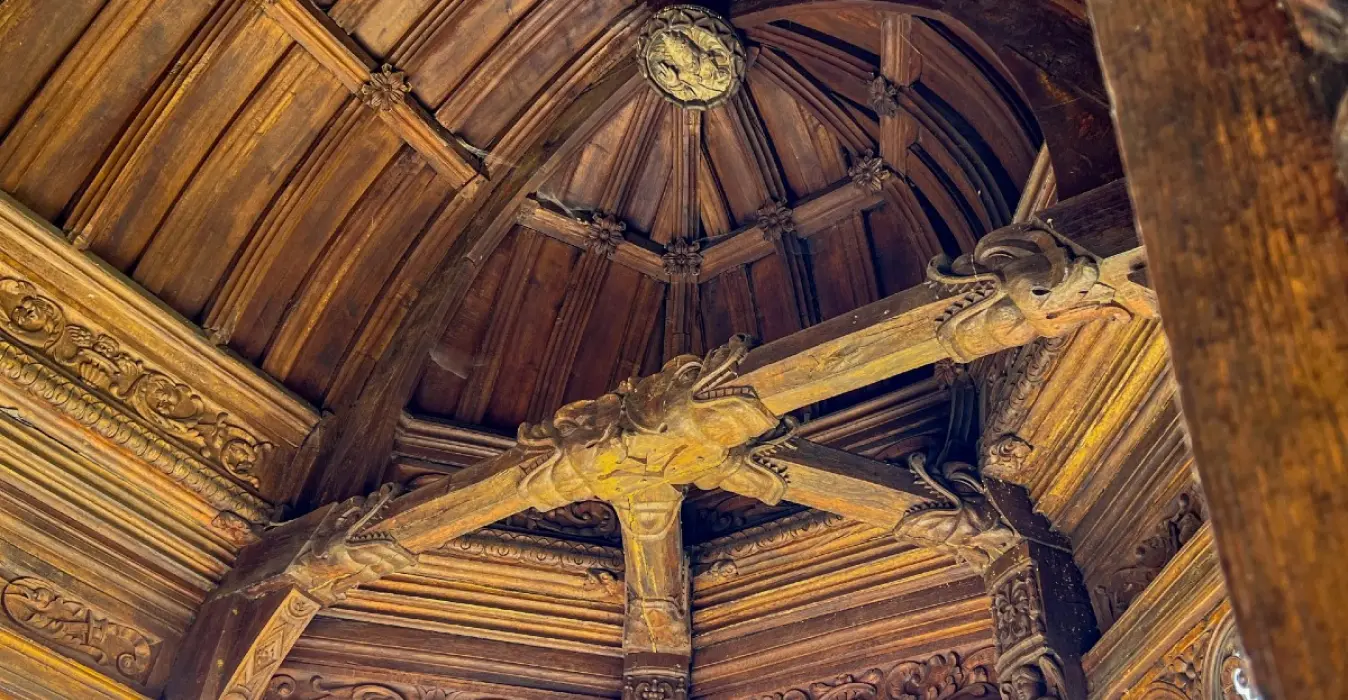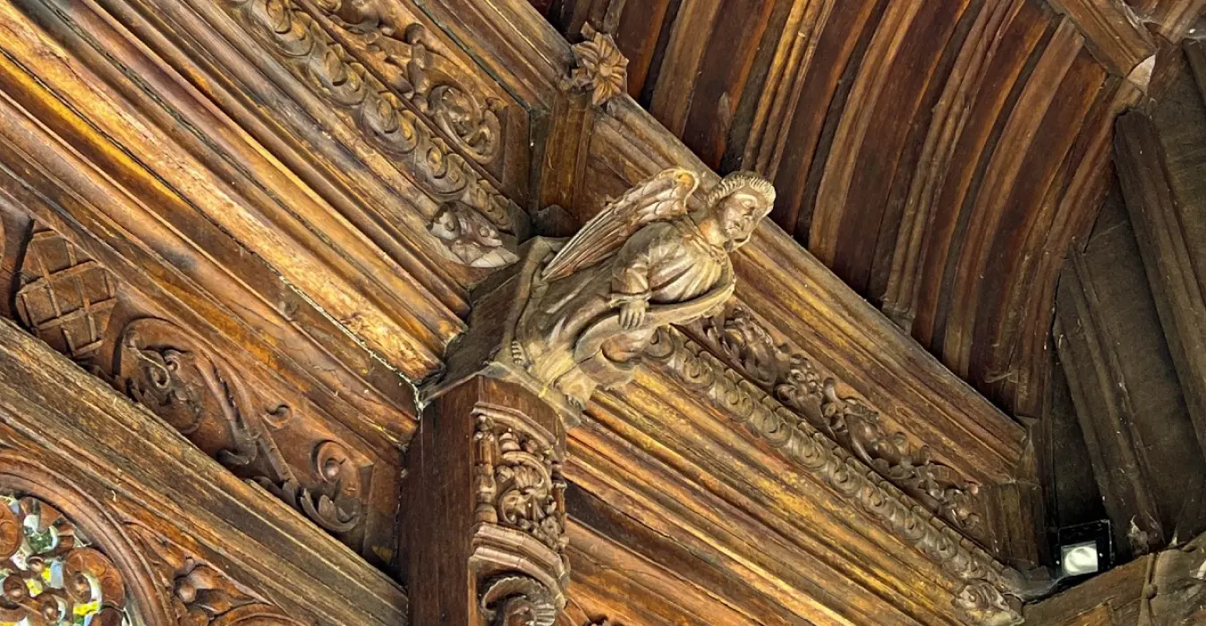 Then we arrive by the side of the church porch and are amazed by the 16th century carved wooden lace, classified as a historical monument and inspired by the Italian Renaissance. Standing on a stone base, the porch contrasts with the simplicity of the church. We admire the finesse and richness of its decoration. Isabelle is shooting with her camera. By zooming in, she can observe the details of the biblical figures, the animal or warlike representations. On my side, I am intrigued by the figures of the monsters at the end of each beam which support the vault in the shape of an overturned boat, characteristic of the Norman architecture. Isabelle and I are having a contest to see who can find the biblical details in this porch, a true work of art.