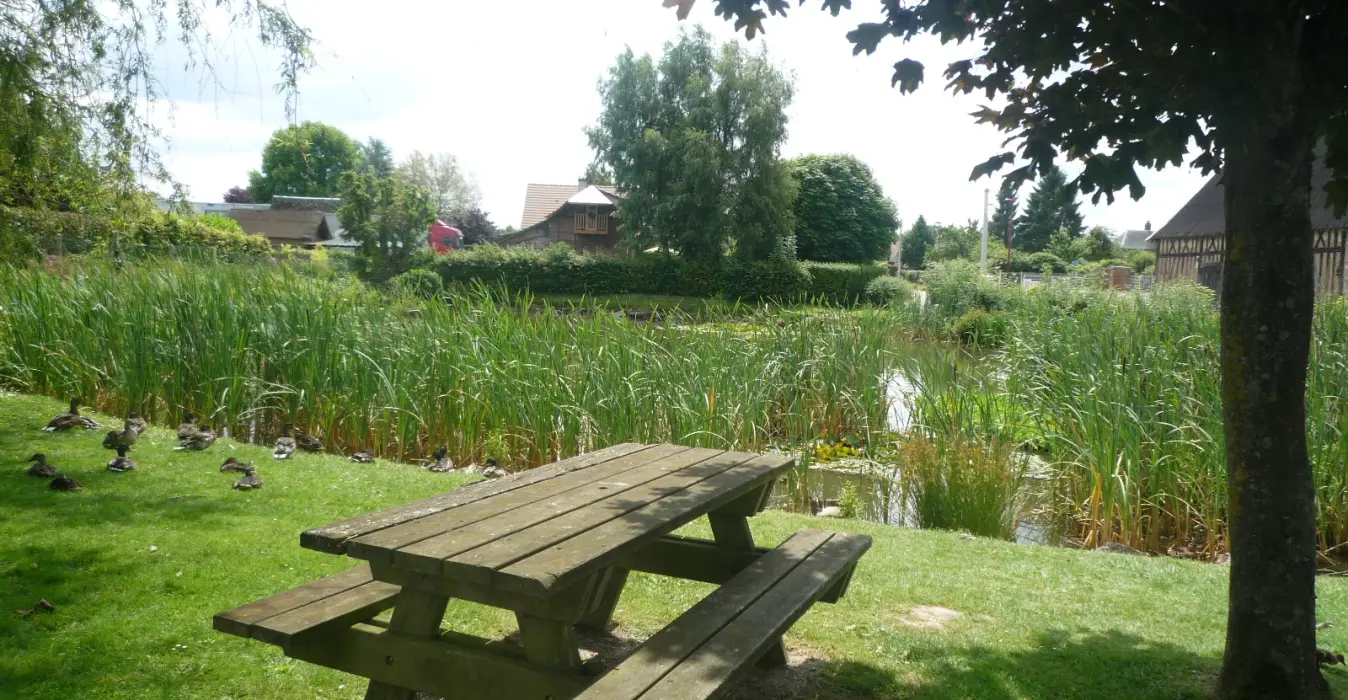 Tables de pique-nique situées dans le centre du village, à proximité de la mairie, à côté de la mare