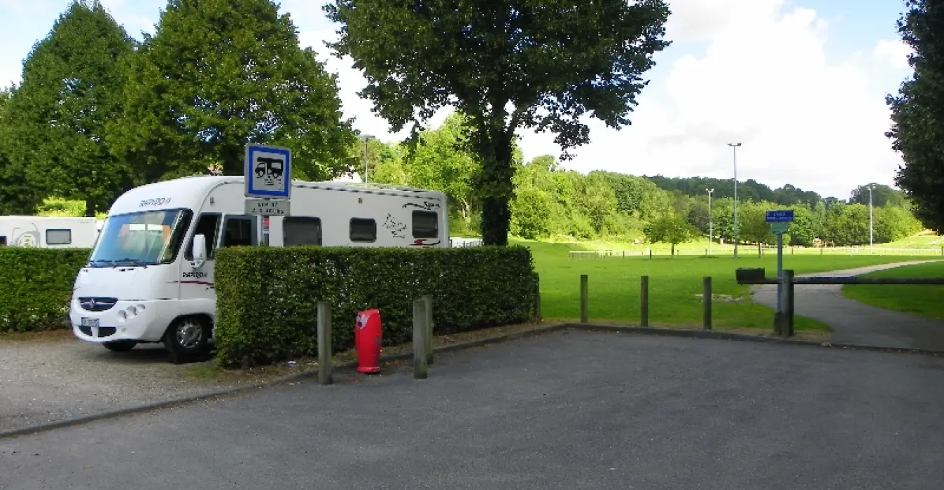 L'accès est fermé. Un stationnement provisoire est autorisé sur les places de parking autocar (stationnement uniquement, pas de service associé, pas de vidange, pas de borne de rechargement).