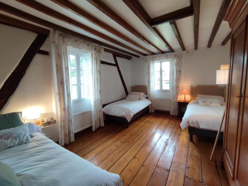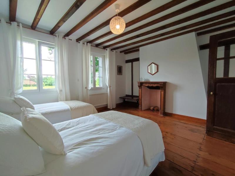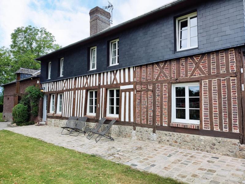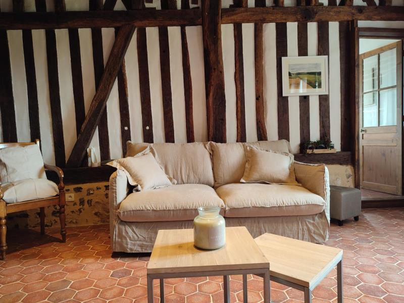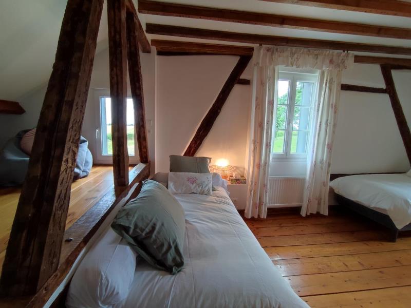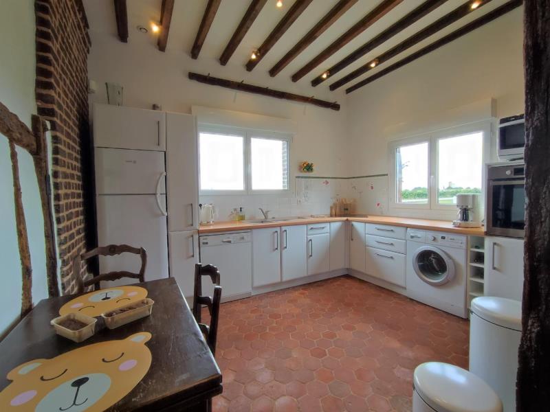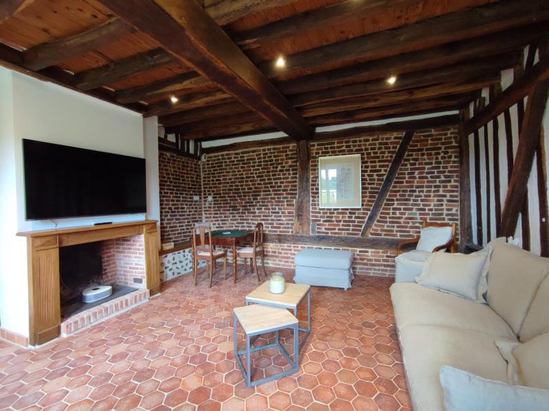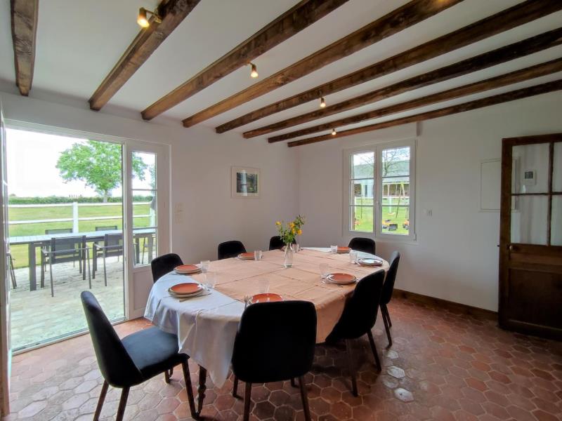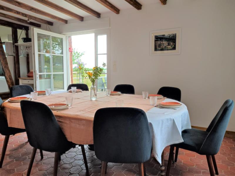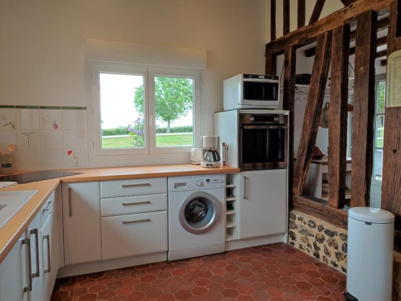 Au rez-de-chaussée : - entrée dans le salon avec belle cheminée cauchoise à l'âtre , - salon avec canapé convertible en lin (couchage de très bonne qualité), TV rétroéclairée 145cm, table de jeux transformable en bureau pour le télétravail (proximité de la boxe internet), - cuisine contemporaine ouverte (plaque induction 3 feux, lave-vaisselle, four, micro-ondes combiné, réfrigérateur/congélateur, lave-linge, robot) séparée de l'espace salle à manger par des colombages : une porte-fenêtre permet d'accéder directement à la terrasse et de profiter d'un très bel environnement, au calme. A l'étage : - wc avec lave-mains, - 1 chambre 3 lits 90x200cm avec petite mezzanine : espace jeux et lecture pour les enfants, - 1 chambre 2 lits 90x200cm, lit bébé à barreaux, - 1 chambre 1 lit 2 personnes 160x200cm, A 1/2 étage, accessible en descendant quelques marches : - salle d'eau avec grande douche à l'italienne 160x95cm, wc cloisonné, baignoire balnéo Equipement bébé à disposition.