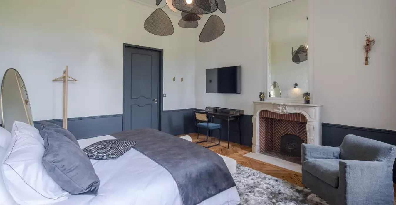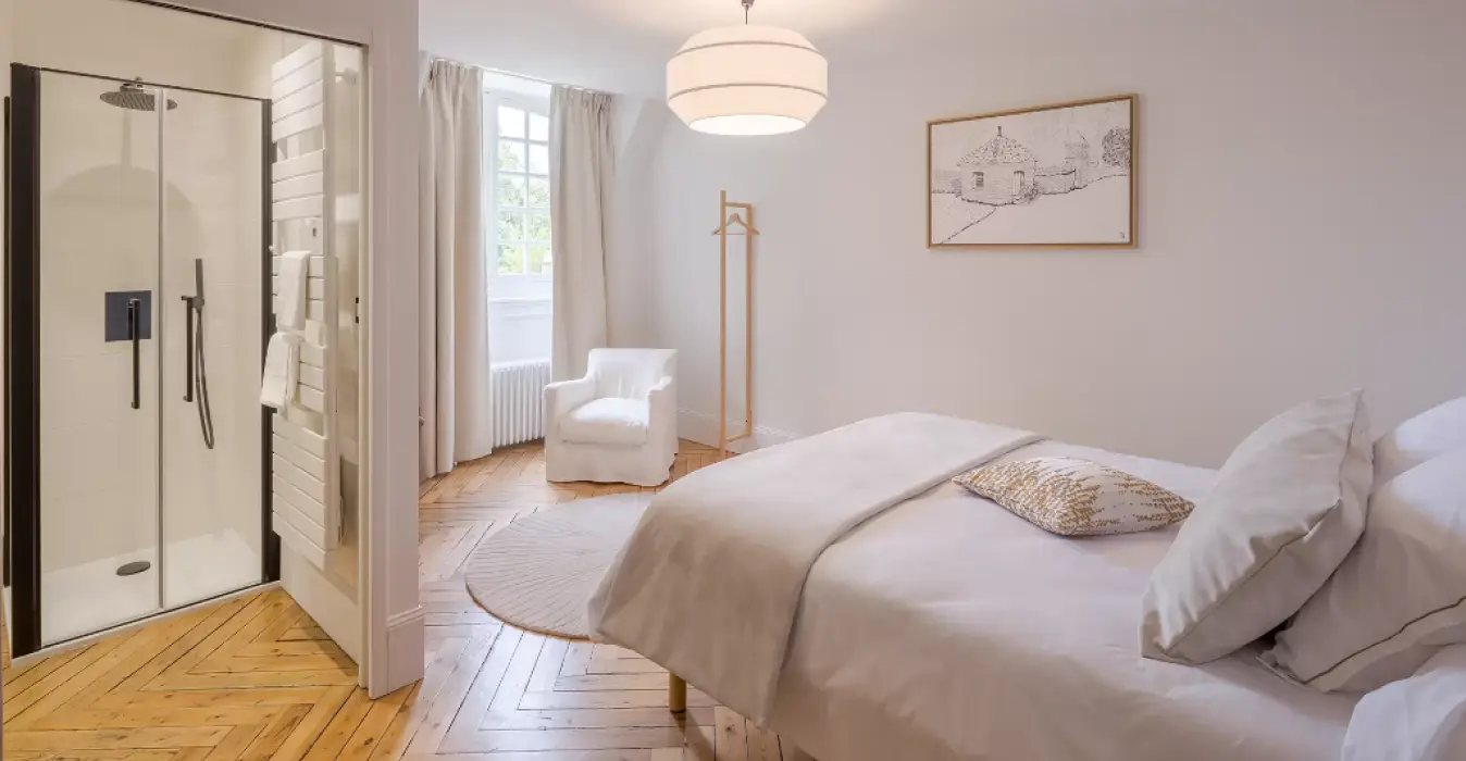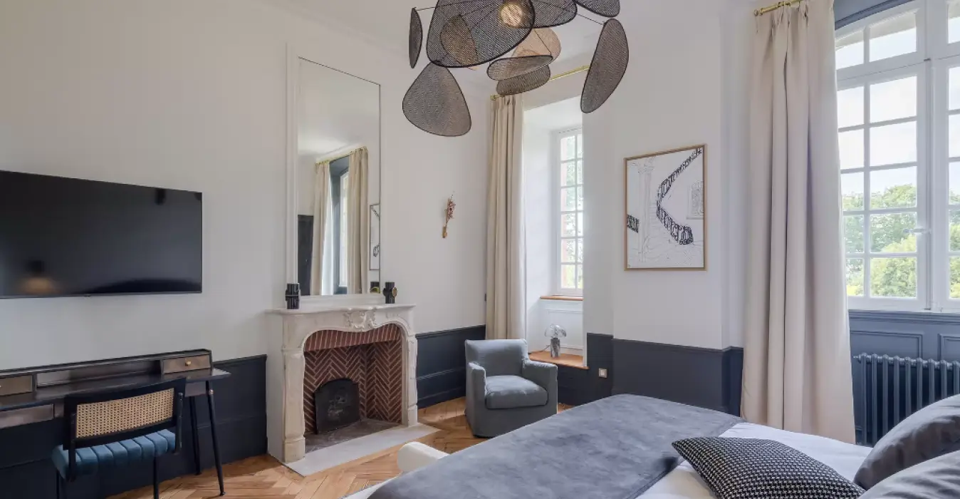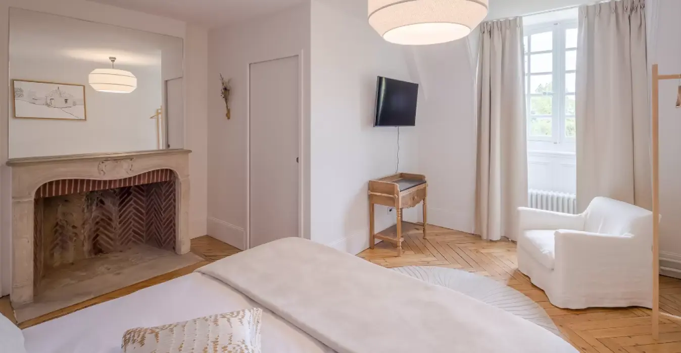 La suite Juliette et sa grande cheminée en pierre et briques dispose d’une décoration épurée et élégante à laquelle s’associe la chaleur du parquet chevron pour une parenthèse relaxante au sein du château.