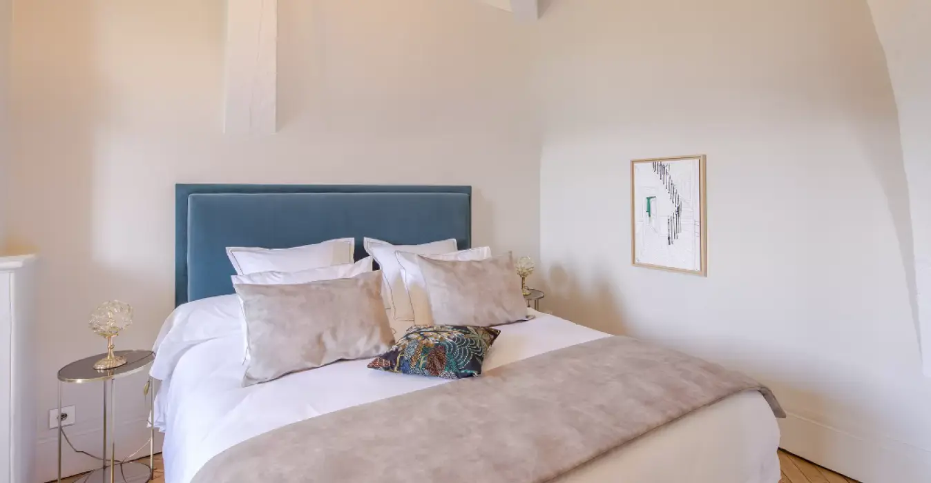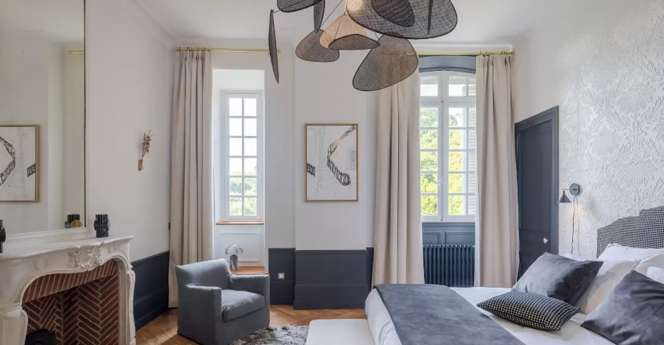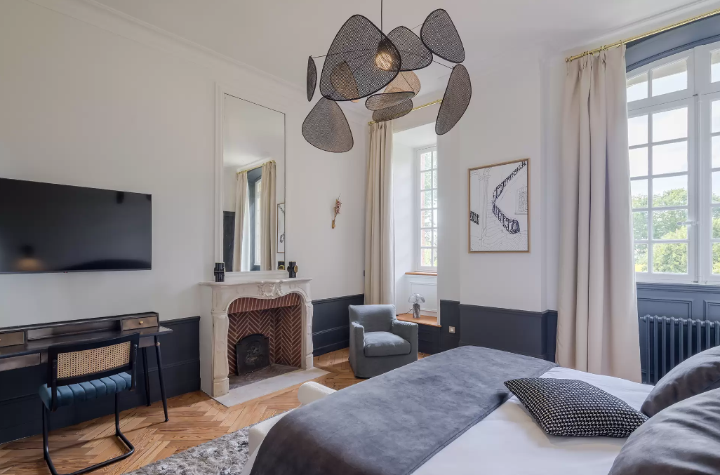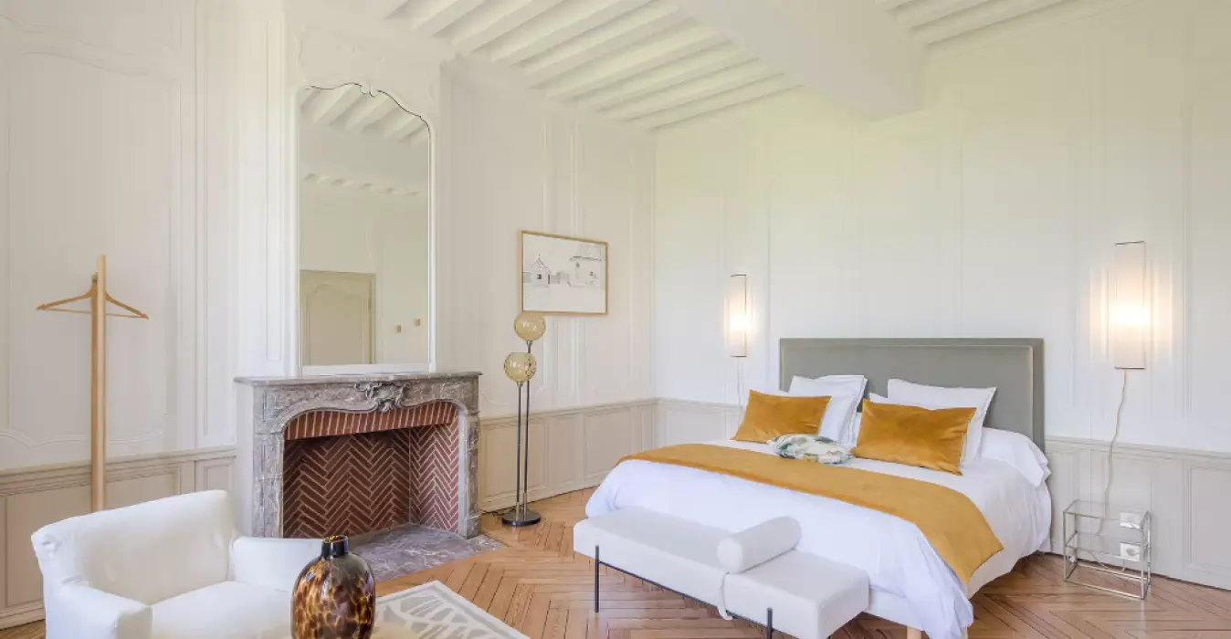 La suite Juliette et sa grande cheminée en pierre et briques dispose d’une décoration épurée et élégante à laquelle s’associe la chaleur du parquet chevron pour une parenthèse relaxante au sein du château.