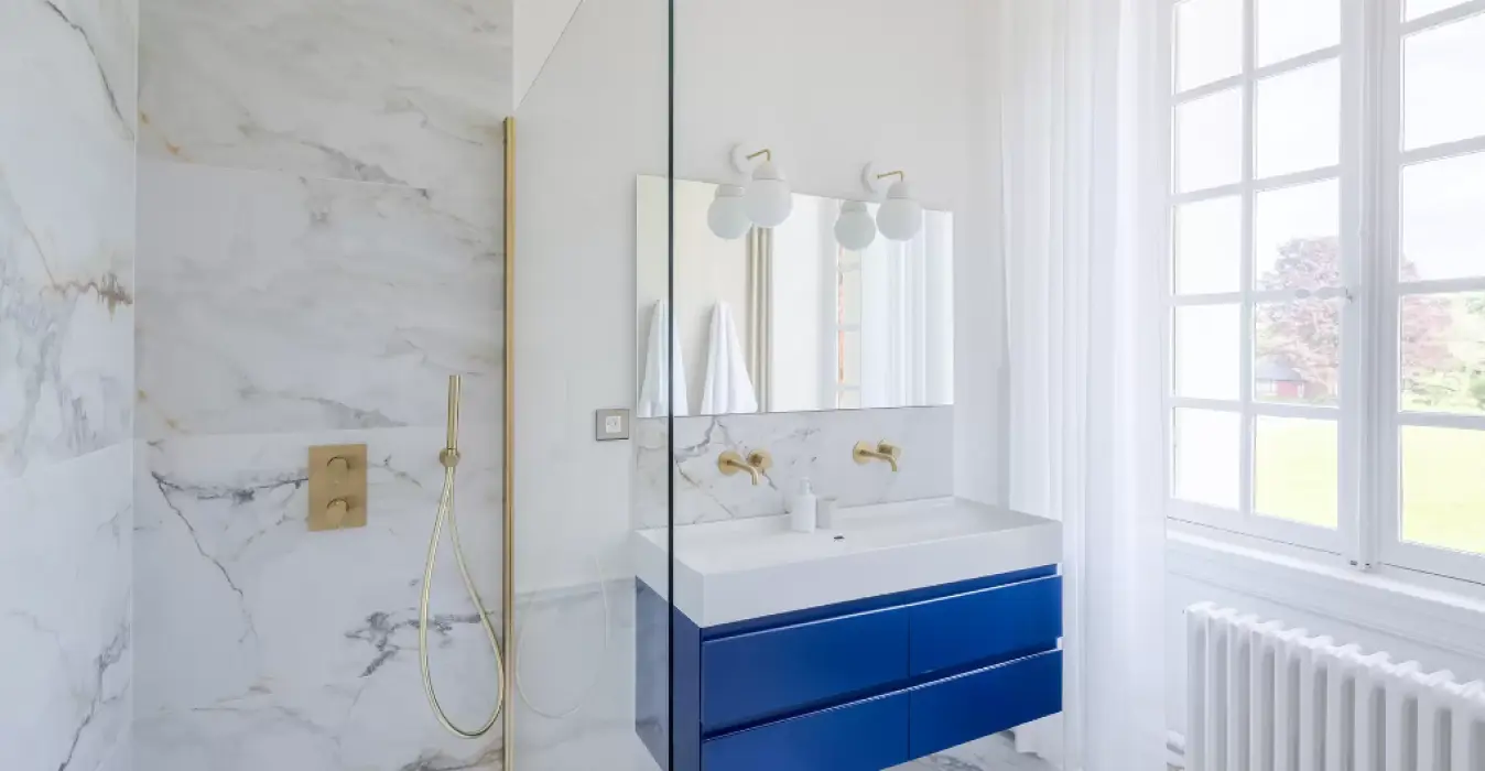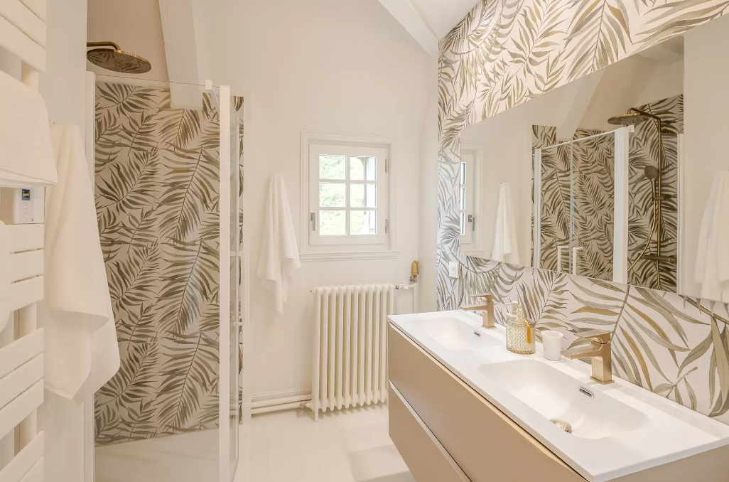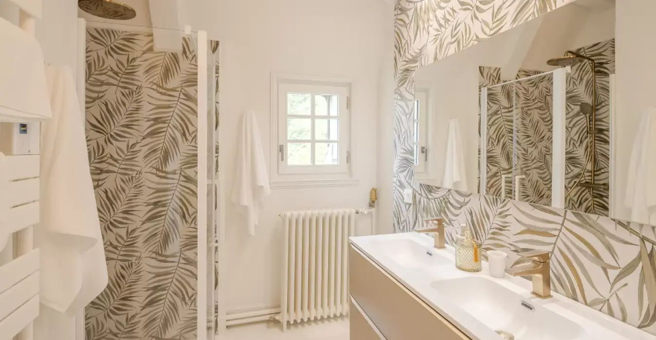 La suite Joséphine est dotée d’une salle de douche à l’inspiration végétale avec un lavabo à 2 vasques et de multiples rangements.