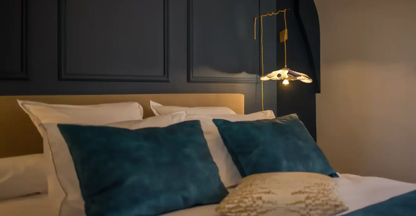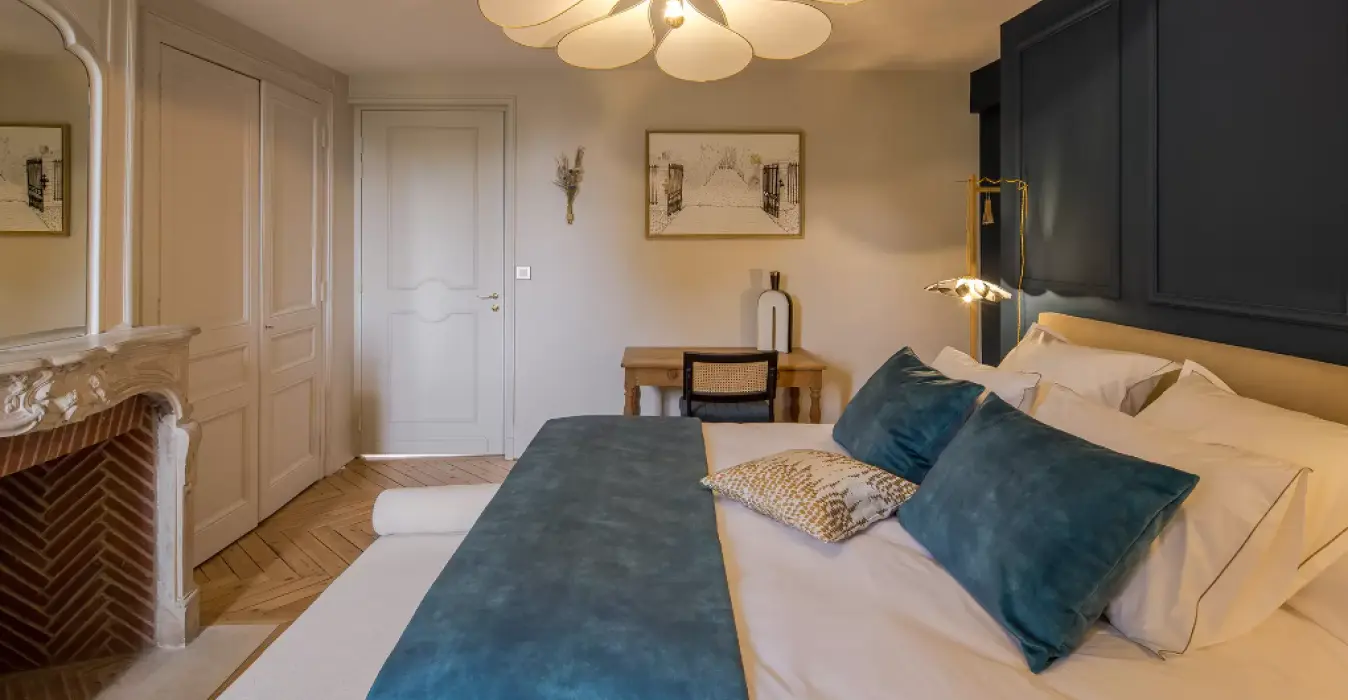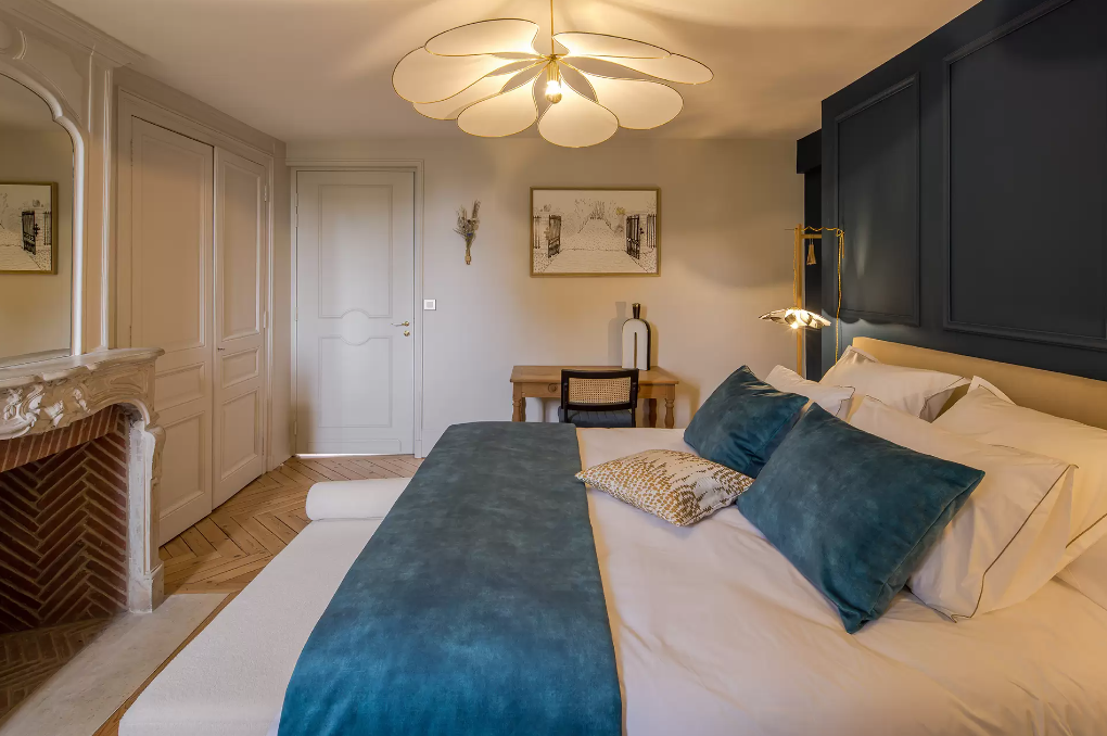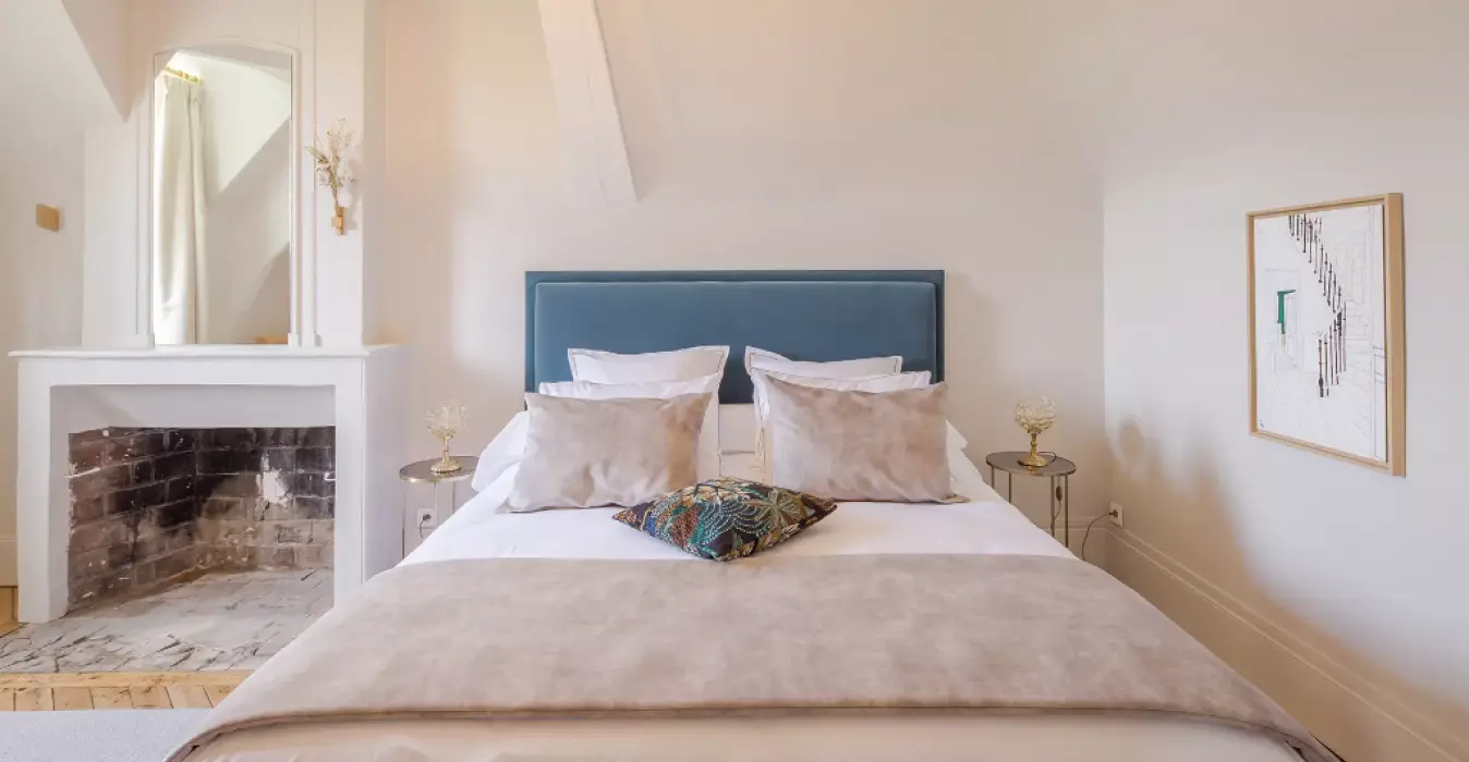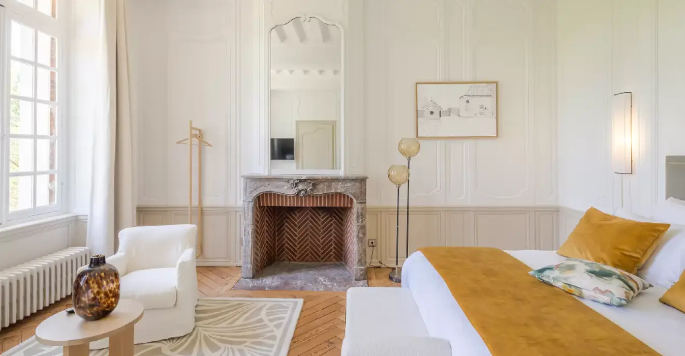 Dans un décor raffiné et moderne, la suite Apolline a su conserver le charme de l’ancien grâce à son parquet chevron et sa cheminée en marbre et briques.