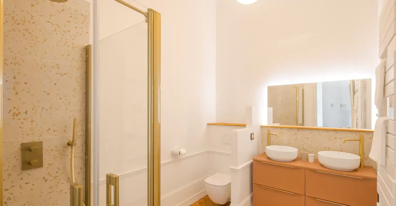 Sa salle de douche privative avec double vasque mixe terrazzo aux couleurs chaudes à un magnifique parquet chevron.