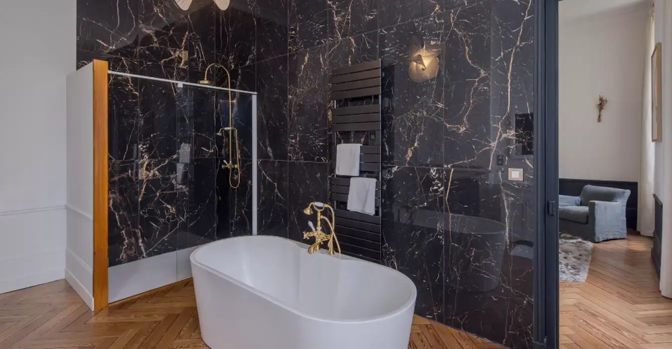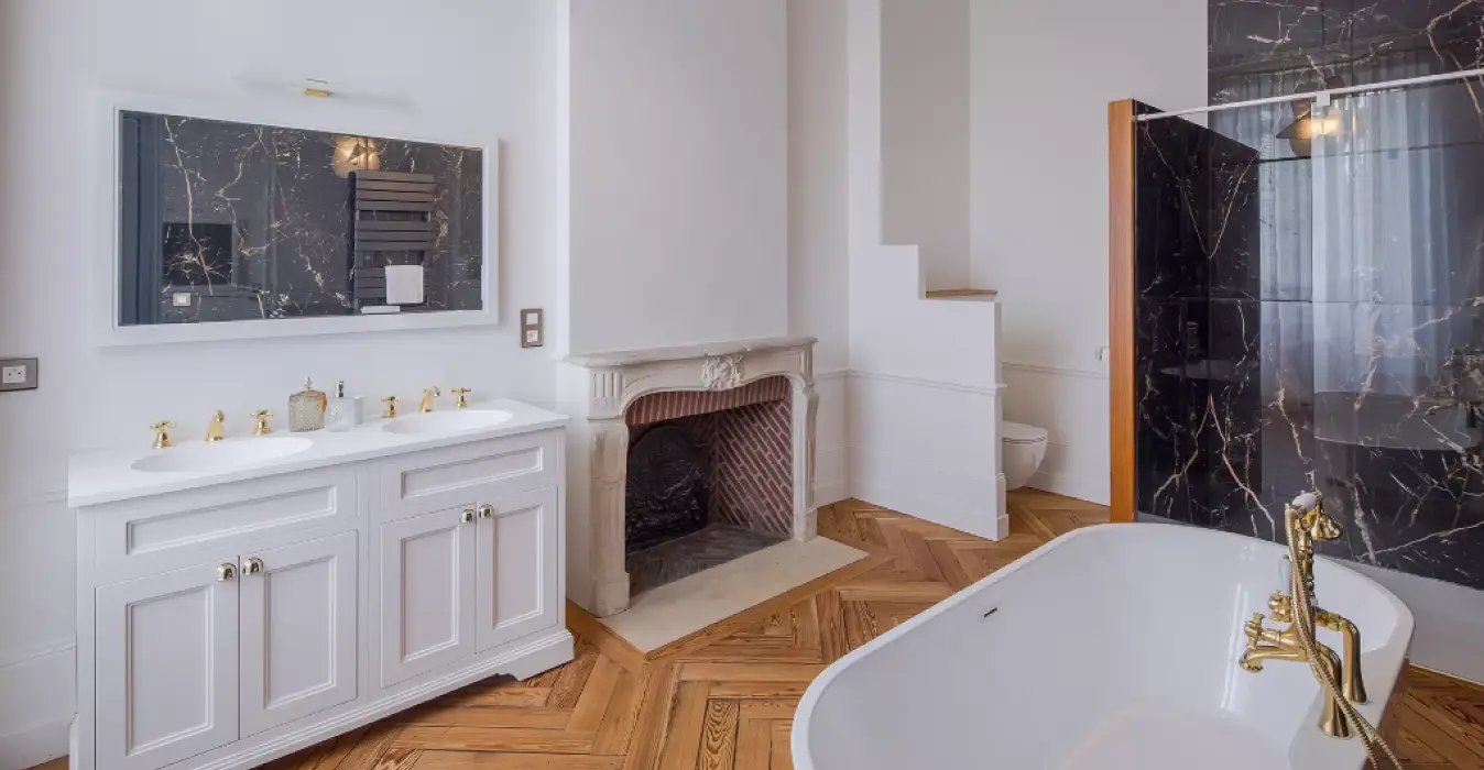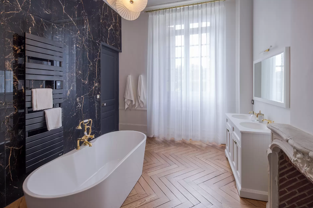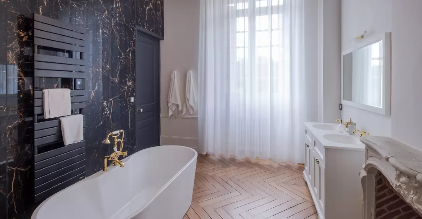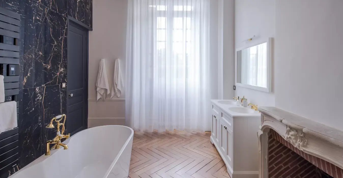 Le parquet chevron de cette superbe suite se retrouve aussi dans sa salle de bain privative. Une double vasque, une douche et une baignoire îlot occupent cette grande salle de bain aux matériaux nobles et élégants.