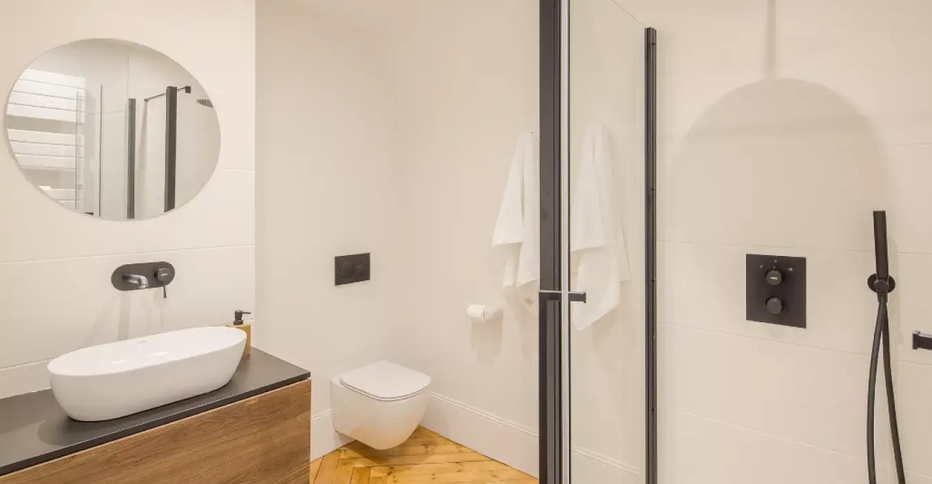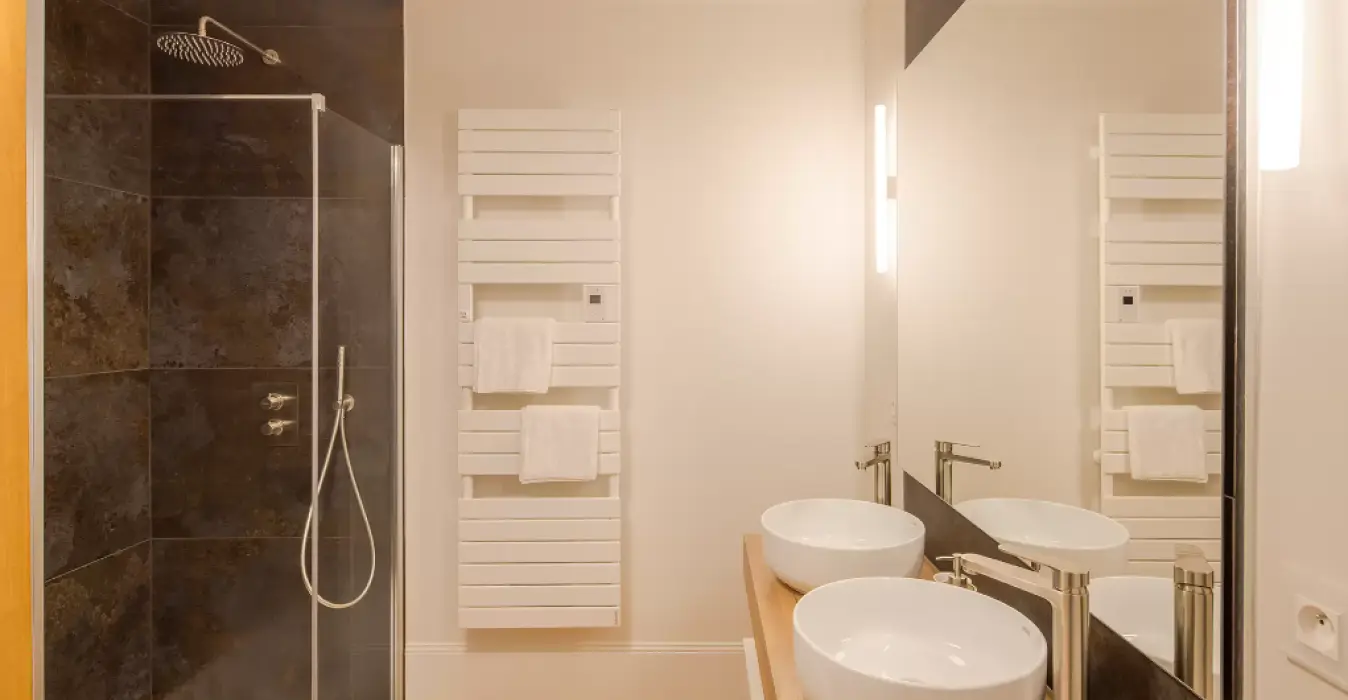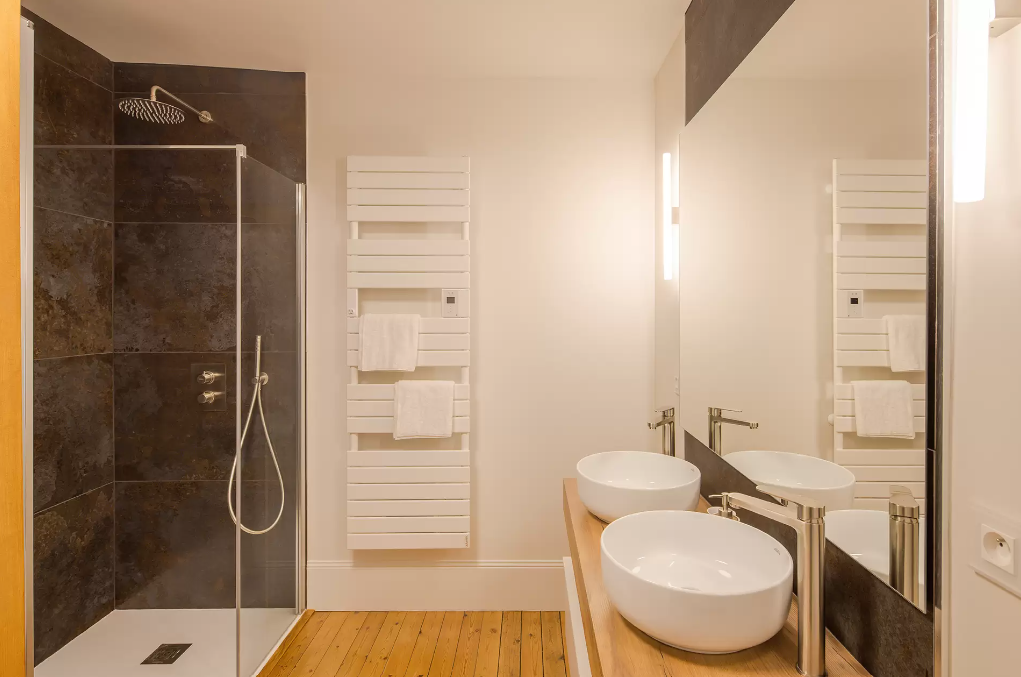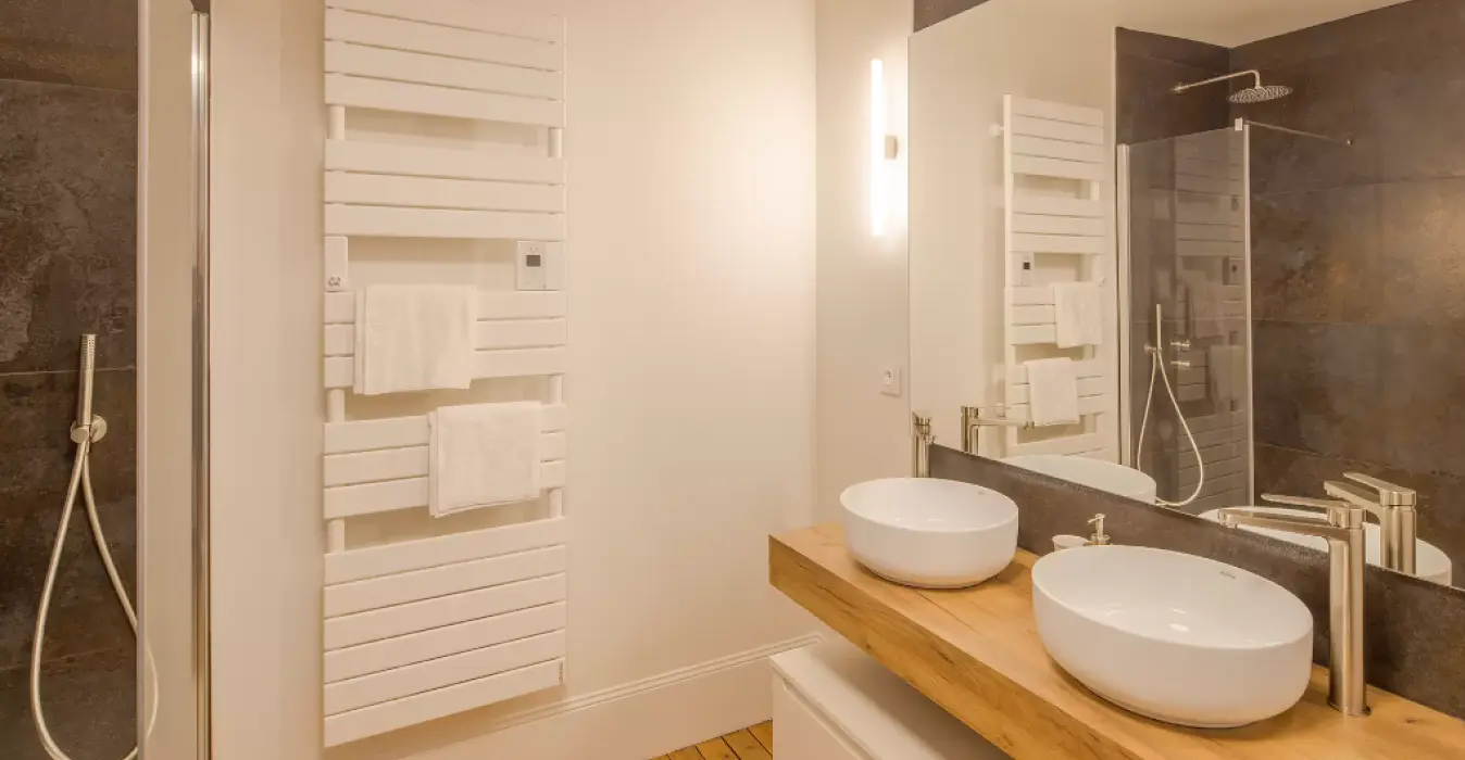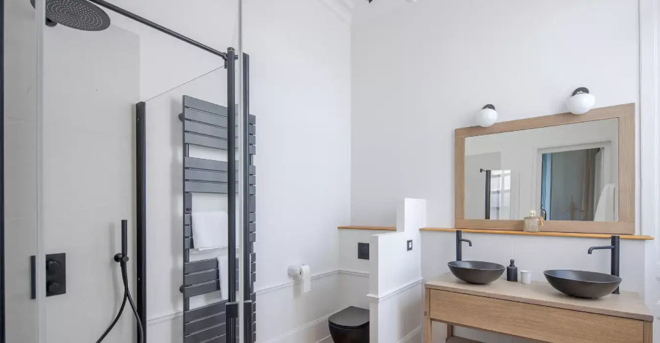 Le parquet chevron de cette superbe suite se retrouve aussi dans sa salle de bain privative. Une double vasque, une douche et une baignoire îlot occupent cette grande salle de bain aux matériaux nobles et élégants.