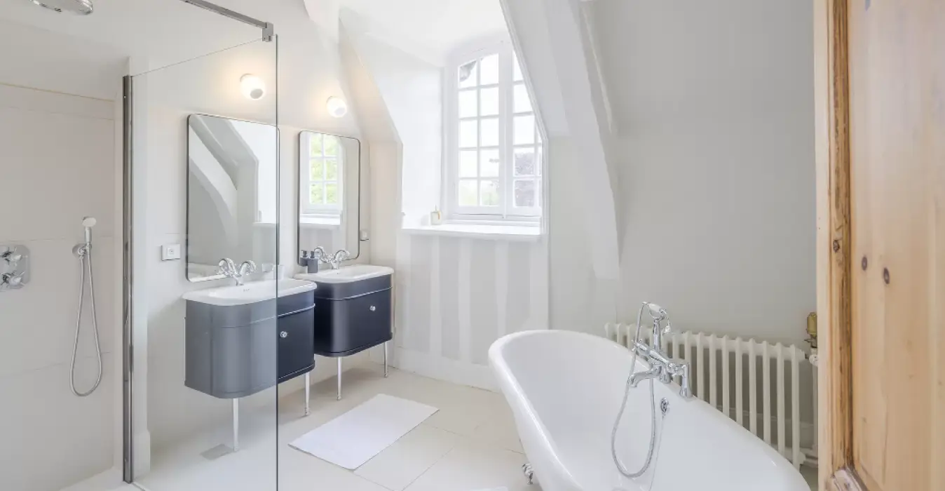 Cette suite à la décoration raffinée vous propose une grande salle de bain équipée de deux vasques, d’une douche et d’une baignoire îlot. Située au deuxième étage sa vue sur le parc du château saura vous conquérir.
